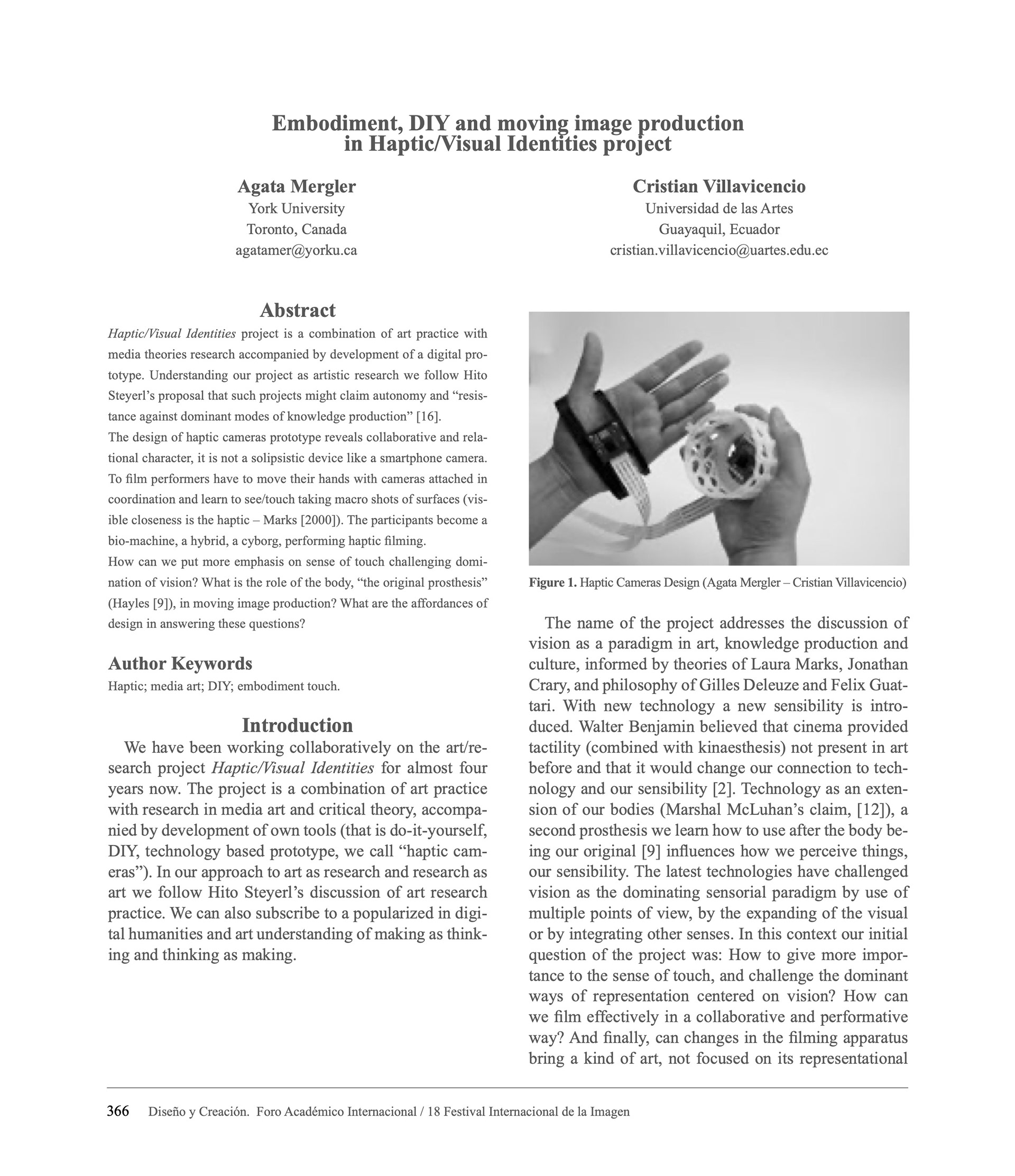 Artículo del proyecto "Haptic/Visual Identities" publicado en el 18 Festival Internacional de la Imagen Universidad de Caldas - Manizales, Colombia. Autores: Agata Mergler - Cristian Villavicencio, 2019 (English)