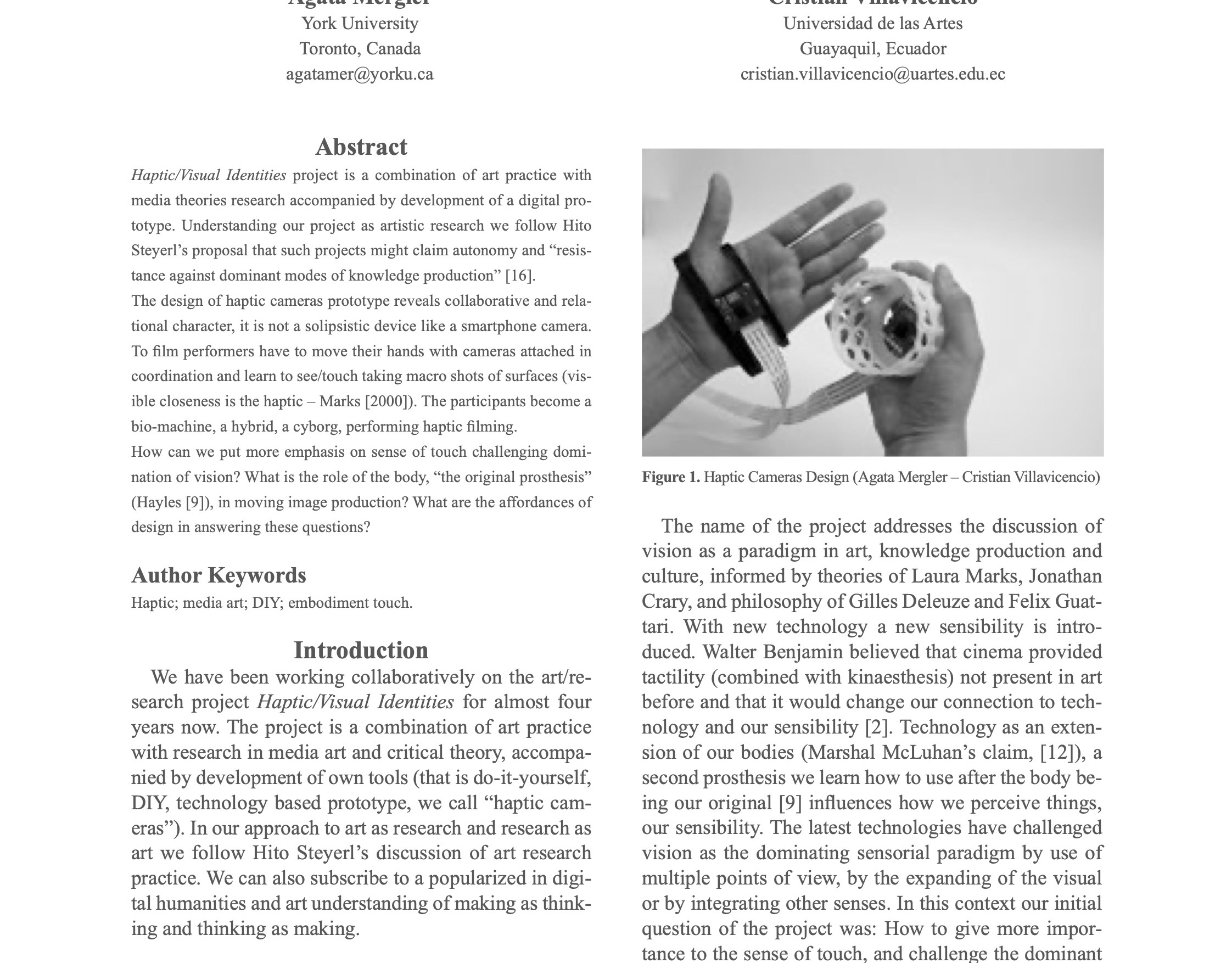 Artículo del proyecto "Haptic/Visual Identities" publicado en el 18 Festival Internacional de la Imagen Universidad de Caldas - Manizales, Colombia. Autores: Agata Mergler - Cristian Villavicencio, 2019 (English)