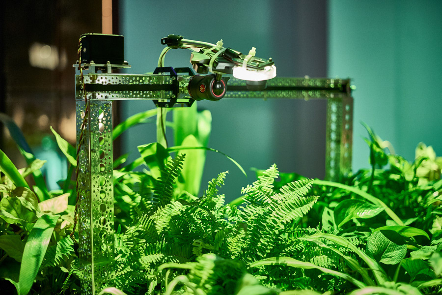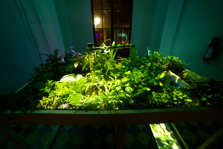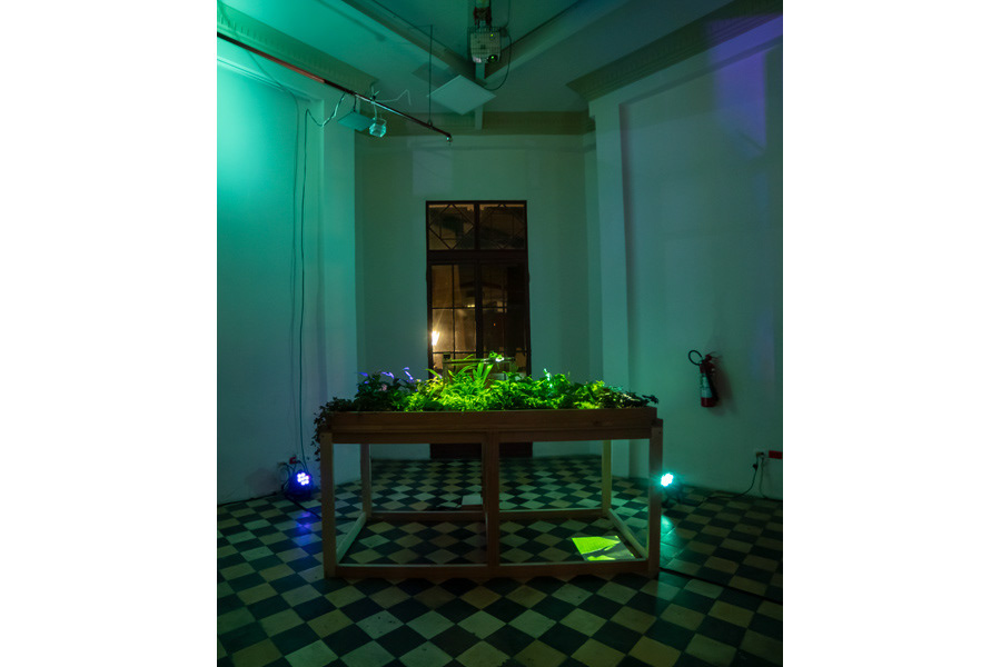 Resiliencia y Ornamento, obra realizada junto a la artista Gabriela Fabre. Es un mobiliario que media la experiencia con un ecosistema vegetal sobre el que se proyecta una imagen microscópica tomada en vivo de él mismo. Un sistema automatizado de riego vierte agua que se convierte en señal sonora a través de un hidrófono. Pensamos en una microreserva viva que se auto sustenta a través de sensores y una automatización de los elementos básicos para su persistencia. Pero también en la posibilidad del sujeto en organizar, seleccionar y confeccionar su microcosmos vegetal.